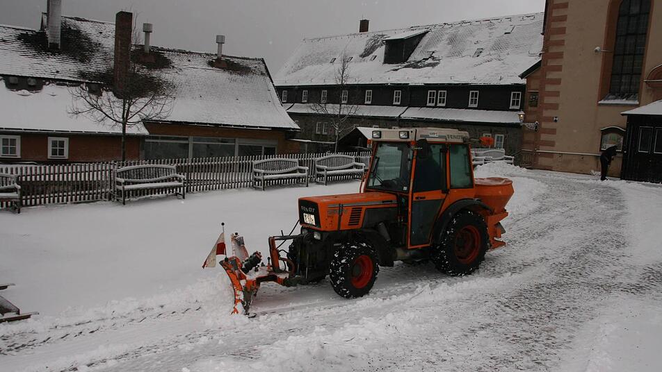Ein Klosterbruder schiebt vor dem Kircheneingang den Schnee zur Seite. Die Kirchgänger sollen gefahrlos in das Gotteshaus kommen. Nein, fotografiert werden will er dabei nicht. Währenddessen kommt ein kleiner Traktor angefahren. Mit dem etwas größeren Gerät werden schon mal die Wege freigeschoben, denn am Wochenende mit dem Weihnachtsmarkt erwartet man viele Besucher (das Kloster ist dann geöffnet).