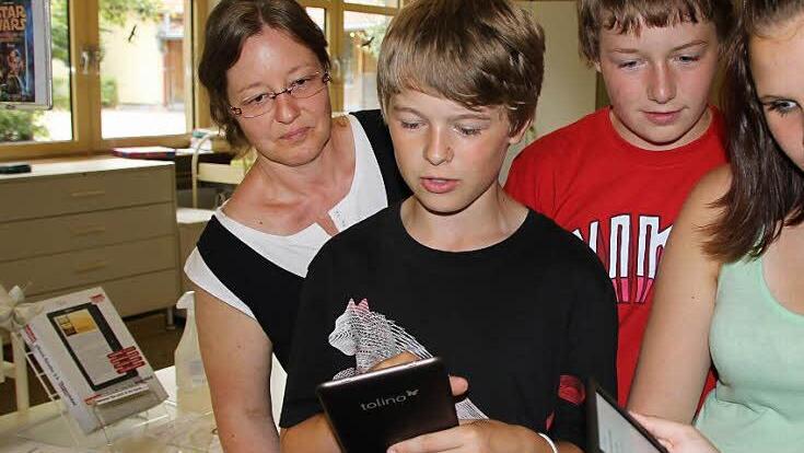 Es wird nicht mehr umgeblättert. Es wird nur noch gewischt. Heike Kettemer nimmt das kleine, handliche Gerät aus seiner Halterung und bewegt ihren Finger über die Oberfläche. Das Cover eines Buches erscheint. Ein paar Wisch-Bewegungen weiter steht das Rezept für einen Sommer-Cocktail. "Es sieht genauso aus wie in einem richtigen Buch", sagt die Bibliotheksleiterin von Wildflecken. Mehr als 2200 Titel stehen hier zur Auswahl.