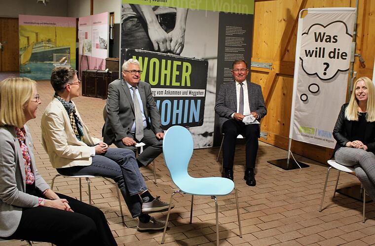 Der Untertitel der Ausstellung "Vom Ankommen und Weggehen" beschreibt ein uraltes Thema der Menschheit und hat vor allem seit der Migrationswelle von 2015 die Stammtische und die Parlamente nicht nur bei uns "in Wallung" gebracht, wie es der Bezirkstagspräsident Erwin Dotzel in seinem Grußwort beschreibt. Ausstellungsmacherin Daniela Kühnel aus Kitzingen bringt das Konzept mit einem Stuhlkreis augenfällig zum Ausdruck. Sechs Stühle in Weiß, exakt im Rund platziert. Dazu ein wenig abseits und irgendwie störend ein baugleicher, aber blauer Stuhl. "Was will der..."? und "Wo kommen die her..."? ist die Plakatwand dahinter überschrieben, die auf menschliches Empfinden, auf "heimisch" und "fremd" anspielt. Diese Fragen begleiten den Besucher durch die gesamte Ausstellung, werden aus verschiedenen Blickwinkeln betrachtet und auf Unterfranken präzisiert.