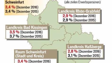Erfreulich und jahreszeitlich unüblich stieg die Arbeitslosigkeit in der Region Main-Rhön im letzten Monat des Jahres nur sehr gering an. Mit 8171 Betroffenen im gesamten Arbeitsamtbezirk Schweinfurt - inklusive Landkreis Bad Kissingen - waren 153 Arbeitnehmer mehr ohne Beschäftigung als im November. Die Arbeitslosenquote stieg lediglich um 0,1 Prozentpunkte auf 3,4 Prozent. Vor einem Jahr wurden 138 Arbeitslose mehr gezählt.