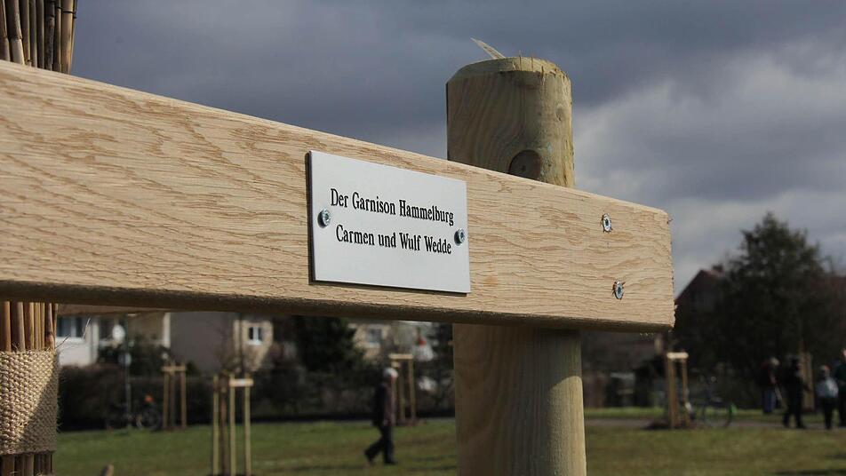 Die Morgensonne strahlte auch auf die junge Zerreiche von Carmen und Wulf Wedde. "Für die Garnison" steht auf dem angeschraubten Metallschildchen. Schnell noch ein paar Gießkannen Wasser auf die frische Erde, damit die Wurzeln des jungen Baumes gut anwachsen. Und dann die Erde gut mit dem Spaten verteilen.