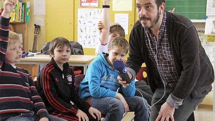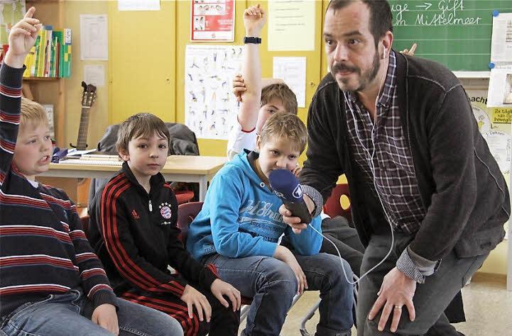 Schnell war die anfängliche Unsicherheit verflogen. Schon bald zappelten die im Kreis sitzenden Schüler begeistert mit hoch erhobenen Armen auf ihren Stühlen, um endlich dran zu kommen. Da hatte Reporter Jochen Wobser leichtes Spiel.