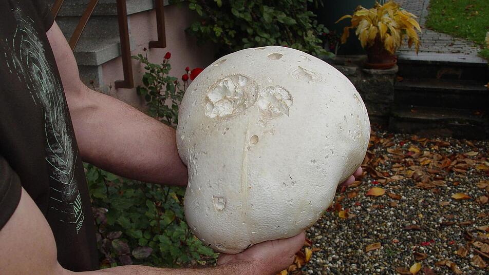 Drei Kilo bringt ein Bovist auf die Waage, den Tanja und Oliver Wehner auf einem Spaziergang vom Kreuzberg nach Sandberg auf einer Wiese entdeckten. "Gut, dass wir schon so nah am geparkten Auto waren", meinte Oliver. "Der Riesenbovist ist einwandfrei. In Scheiben geschnitten und paniert, macht er zehn Leute satt." Dann guten Appetit!