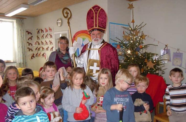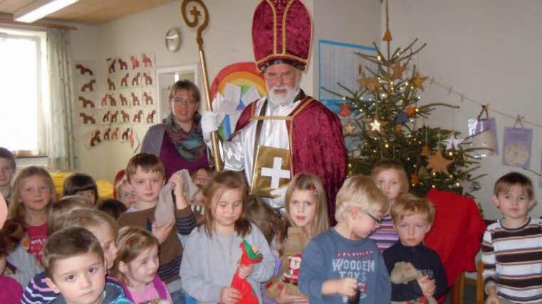 Und immer noch bereiten ihm die Termine sehr viel Freunde. Die Reichenbacher Kindergartenkinder, die wegen des Umbaus ihres Kindergartens in Räumen der Alten Schule untergebracht sind, freuten sich besonders, dass er den Weg zu ihnen gefunden hatte. Zusammen mit ihrer Leiterin Gabi Gessner und dem gesamten Team hatten sie Nikolauslieder einstudiert, die sie zu seinem Empfang sangen. Sie wussten auch schon Bescheid, dass der heilige Mann aus der Türkei stammte. Einige hatten dort schon Urlaub gemacht. Neugierig nahmen die Kinder die gut gefüllten Nikolaussocken in Empfang. Als Dankeschön schenkten die Kinder dem Nikolaus ihre selbst gemalten Bilder.