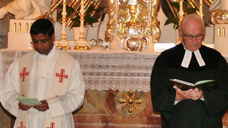 Ausgestreckte, helfende Hände waren der rote Faden, der sich in den Wortbeiträgen, der Predigt und den Liedern wiederfand. Der Psalm "Brich mit den hungrigen dein Brot" führte Pater Raja zu einer Beschreibung von Not und Armut in der dritten Welt; einer Lebenswirklichkeit, die er in dem kleinen südindischen Dorf in dem er aufwuchs selbst erlebte.
