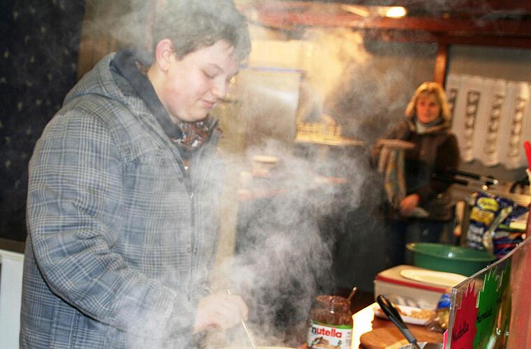 "Arbeitsplatz" bezogen. Er hilft seinen Eltern da, wo er gerade gebraucht wird. Schenkt mal in der einen Bude Glühwein aus, um kurze Zeit später im Stand gegenüber eine Crêpe auf der Platte zu rollen. "Meine Eltern sind Schausteller", sagt der aufgeweckte Nüdlinger. "Sie haben eine rollende Brezelbäckerei. Mit der ist Papa in ganz Bayern auf Märkten unterwegs und Mama betreibt den Imbissstand in Nüdlingen. Nur am Weihnachtsmarkt sind sie zusammen.
