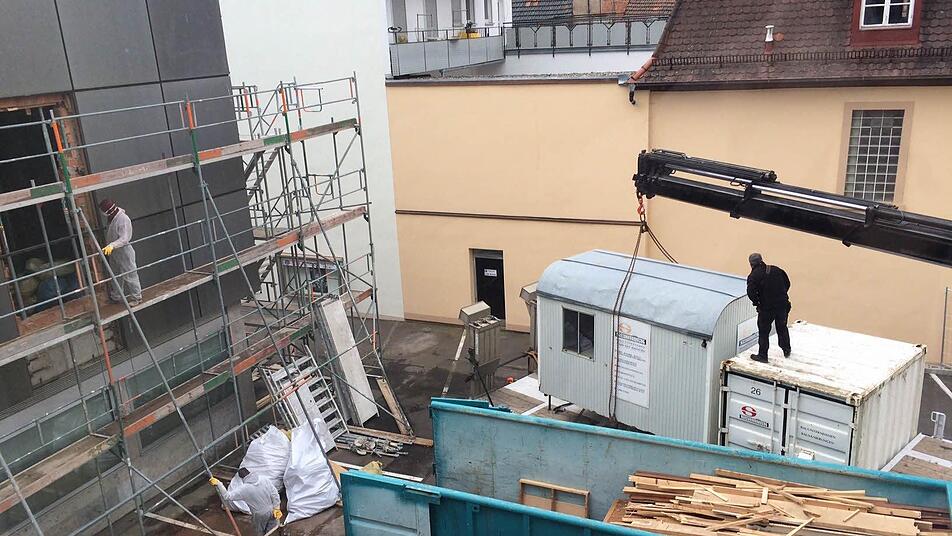 Langsam kommt Licht ins Dunkel: Stein für Stein schlagen Arbeiter Löcher in die Außenwände des großen Sitzungssaales neben dem Landratsamt. Von der Fußgängerzone aus ist davon noch nichts zu erkennen: Die Metall-Fassade, die dem markanten Quader den Spitznamen "Kaaba" eingebracht hat, ist zum größten Teil noch geschlossen: "Wir wollen den Freisitz des Cafés unten so lange wie möglich erhalten", sagt Gebäudemanager Christian