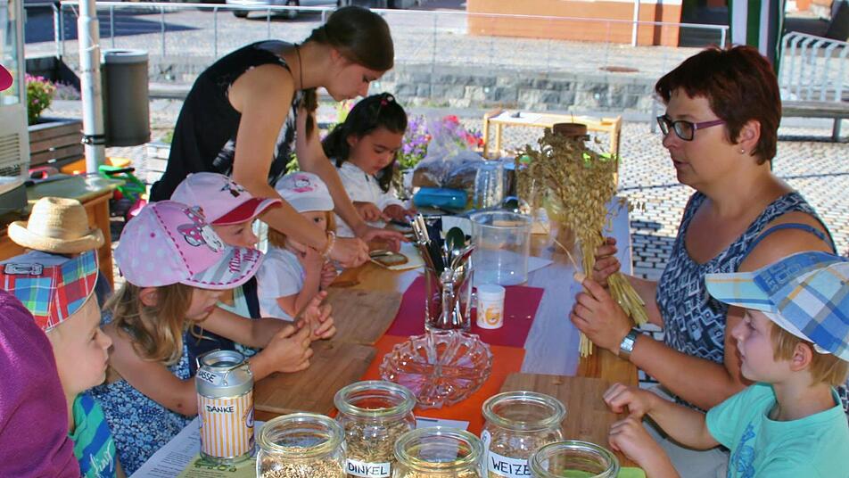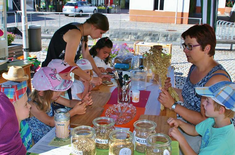 Regionalität ist Trumpf Inzwischen hat Katja Endres vom Kindergarten Gefäll ihre Vorschulkinder vom Maltisch zum Stand von Anja Wagenbrenner begleitet, die für ihren "Lernort Bauernhof" unterschiedliche Getreidesorten mitgebracht hat.