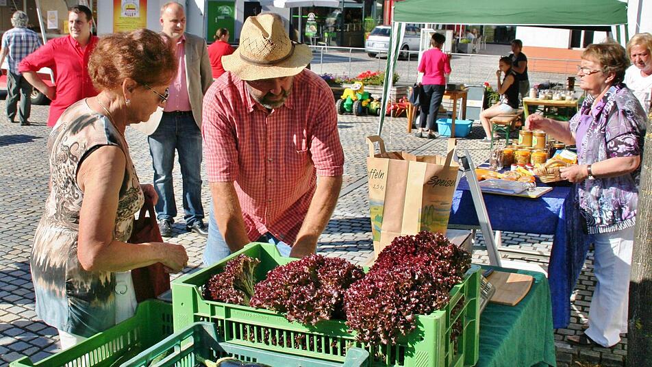 "Die gelben Rüben bringst du bei der Trockenheit nicht aus dem Boden raus". Hans Pfülb vom Naturlandhofaus Fuchsstadt kann nicht alle Wünsche der Kundin Ulrike Straub aus Stralsbach erfüllen. Die Kartoffeln, Marke Marabel, dagegen sind gut gewachsen, meint der Landwirt, der seinen Stand erstmals in Burkardroth aufgebaut hat. "Allerdings ist auf dem Feld auch eine Tröpfchenbewässerung installiert", klärt er die Kundin auf.