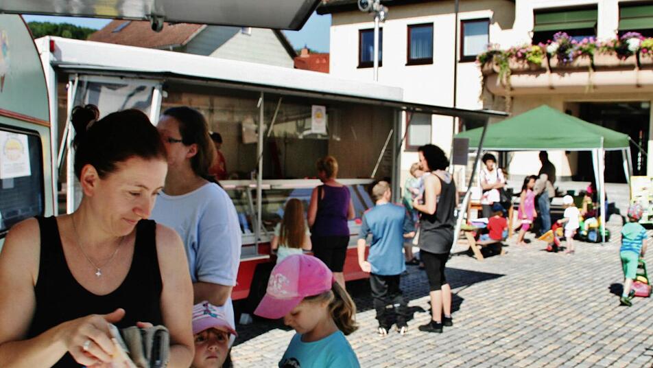 "Es sind solche Gespräche, die den Reiz des Einkaufs auf dem Wochenmarkt ausmachen", meint Ulrike Straub, die das Angebot nutzt, wann immer Gelegenheit dazu da ist. Gegenüber am Stand von "Eis Anna" bildet sich die erste Schlange, weil Sonja Schmitt heute auch Milchshakes mixt: "Das dauert etwas länger, aber für das Ferienprogramm des Marktes mach ich das gerne", meint die Eiskonditorin aus Schondra, die seit einem Jahr den eingeführten Namen "Eis Anna" von