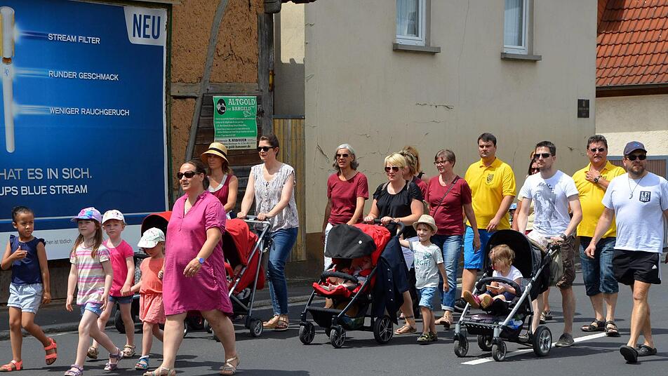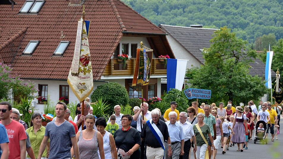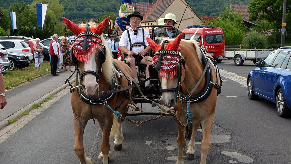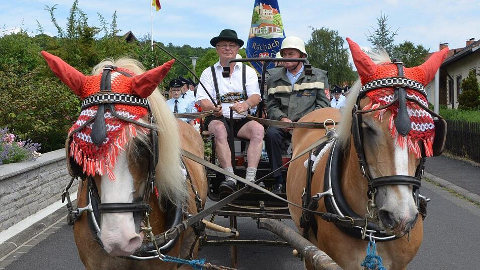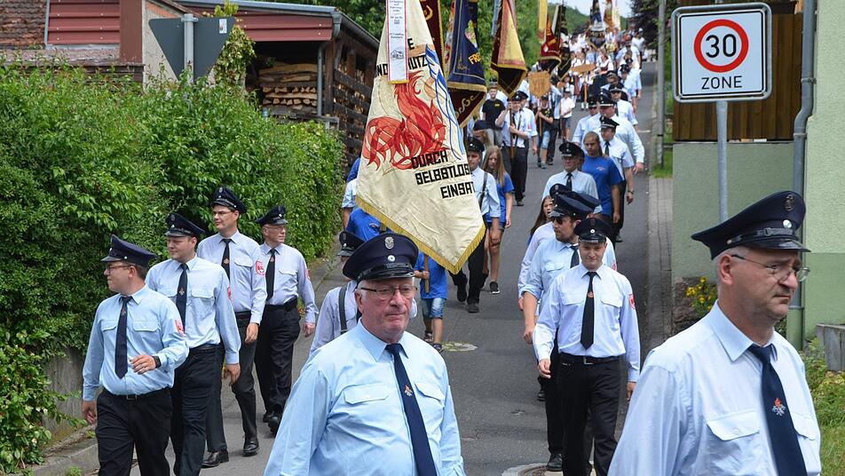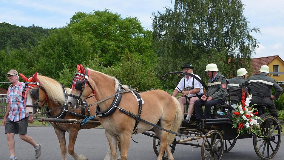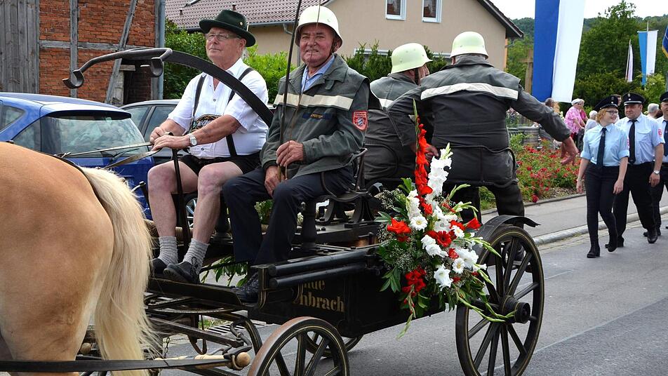 Ihr 140-jähriges Gründungsfest feierte die Freiwillige Feuerwehr Großenbrach am Wochenende nicht nur mit Festbetrieb im Zelt, sondern auch mit einem großen Umzug durch den Bad Bockleter Marktgemeindeteil Großenbrach. Rund 20 Feuerwehren aus der Umgebung, vor allem aber die Ortsvereine, brachten Farbtupfer in den mehrere hundert Meter langen Festzug. Angeführt wurde der Zug von der historischen Handspritze der Großenbracher für die man zwei Zugpferde aus Poppenlauer kommen ließ. Dahiner gleich die Ehrengäste, an ihrer Spitze Bürgermeister Andreas Sandwall, die Kreisbrandinspektion war durch Kreisbrandmeister Steffen Kiesel vertreten. Dazu spielten Musikkapellen.