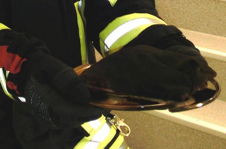 Kirschkernkissen, das in einer Mikrowelle eigentlich nur erwärmt werden sollte. Allerdings hatte irgend jemand die Leistung unterschätzt, bzw. das Gerät nicht ausgeschaltet, so dass Kirschkerne und Kissenbezug zu kokeln anfingen und damit einen automatischen Alarm auslösten. Nachdem der qualmende und stinkende "Übeltäter" von einem Feuerwehrmann ins Freie gebracht wurde, kam noch der Hochdrucklüfter zum Einsatz, so dass schon nach wenigen Minuten wieder