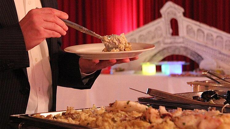 Italienisch an den optischen Kulissen der venezianischen Rialtobrücke und des schiefen Turms von Pisa war das Festbankett des Hotelrestaurants im Dorint Resort im Lola-Montez-Saal ausgerichtet. Dort baten die Köche zu Meeresfrüchten, Polenta, Oliven, Garnelen, Kalbs-Involtini (gefüllte Röllchen), Nudelgerichten, gegrillter Kalbsleber, Vanillegebäck, Krapfen, Cremes, Eis und Kürbissorbets an das warm-kalte Büffet. Auf die Tanzfläche des Kursaals lockten die Klänge des Annika-Bosch-Quartetts. "Wir spielen heute das erste Mal in dieser Region", bestätigte die Chefin der aus Weimar stammenden Band. Alle vier Musiker seien Studierte, bestätigte Bosch.