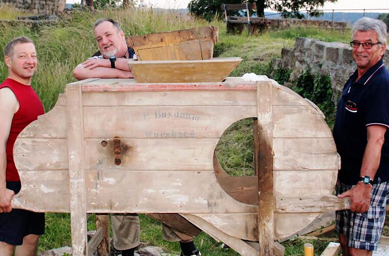 Freilich haben die einstigen Bewohner von Burg Botenlauben, die Getreideputzmühle, woanders auch Kornfege genannt, noch nicht gekannt. Sie haben das Getreide noch mit Schaufeln in die Luft geworfen, damit der Wind die Spreu vom Weizen trennt. Aber viele der Älteren konnten sich noch an die Zeit vor Dreschmaschine und Mähdrescher erinnern, als die "Rotationsworfelmaschine",wie sie offiziell heißt, die mühsame Handarbeit ein wenig erleichterte.
