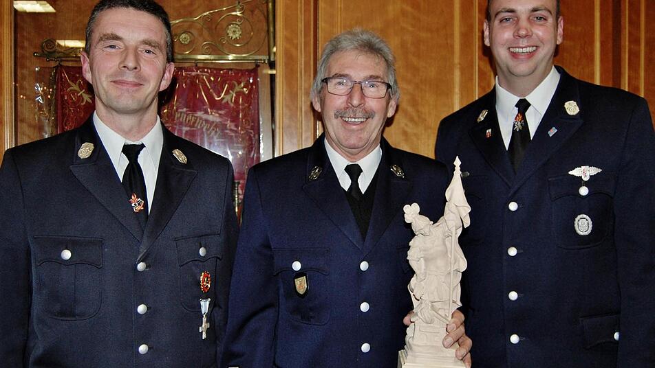 Aus dem aktiven Dienst wurden nach 48 Jahren Hans Brehm und nach 44 Jahren Rudolf Kiesel mit einem Präsentkorb verabschiedet. Kiesel wurde zusätzlich für seine besondern Leistungen mit einem hölzernen St.