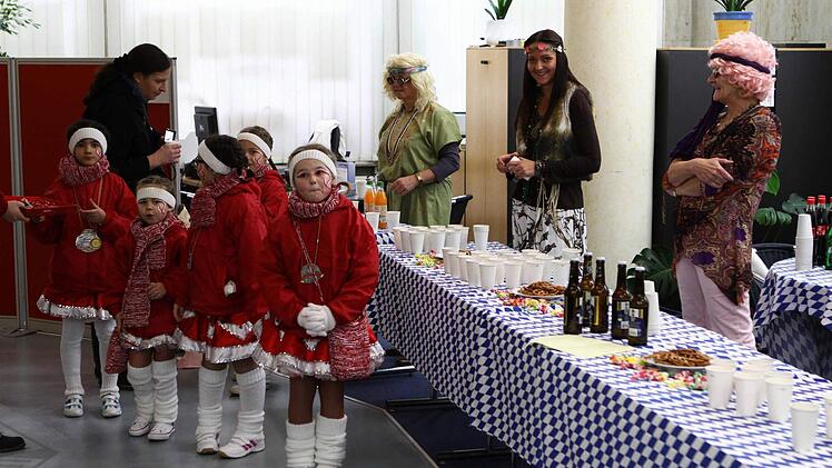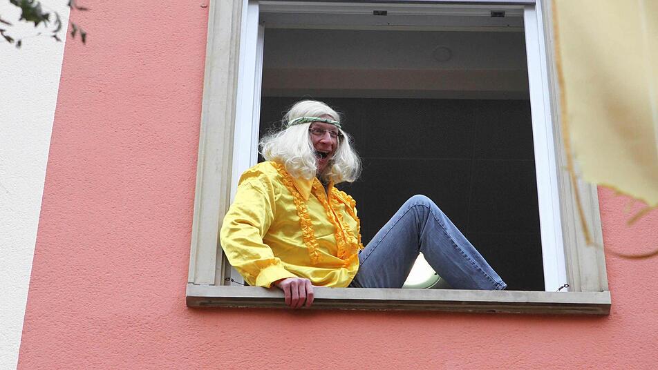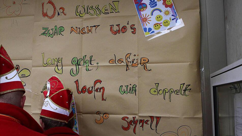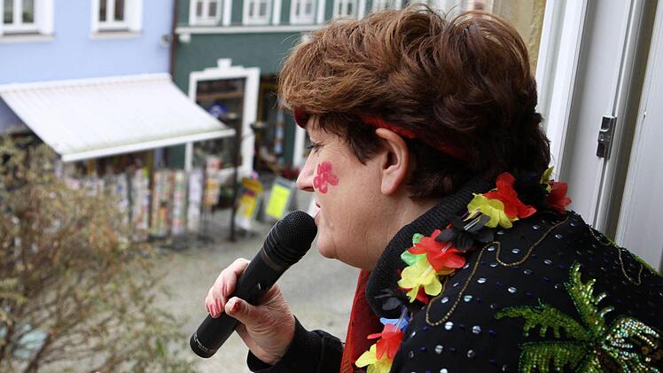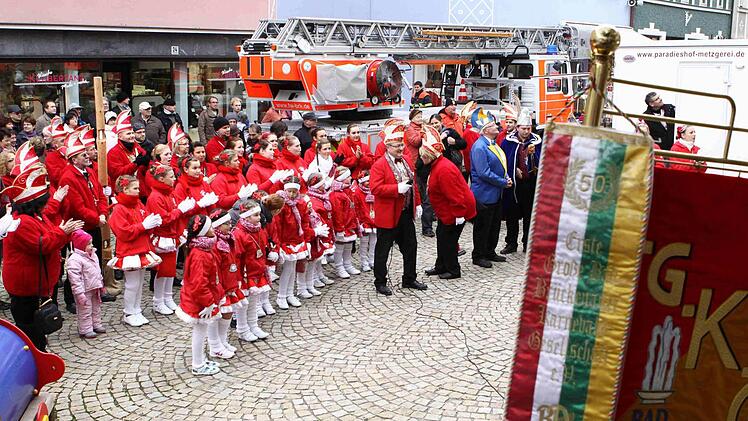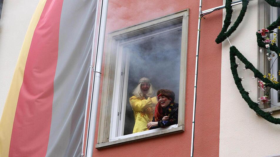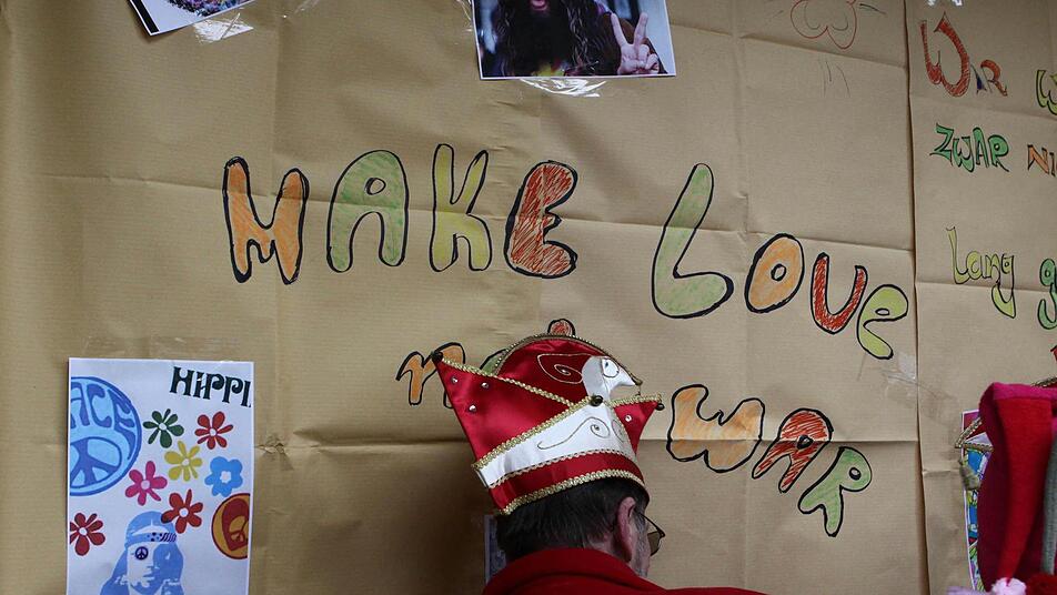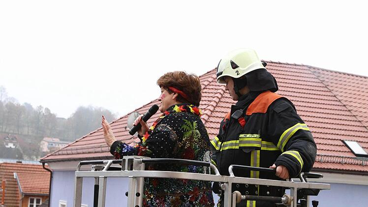 "Flower power" und "Make love - not war", lautete das Motto des Rathaussturms seitens der Verteidigerseite. Retten und bergen war wohl eher die Devise der angreifenden Karnevalisten. Hatten sie sich doch durch die Widmung ihres aktuellen Ordens für das Feuerwehrjubiläum diese quasi als Verstärkung eingekauft und kamen mit der neuen Drehleiter einfach von oben zum Sturmangriff, deklariert als Rettung der Bürgermeisterin.Und so nutzte es auch wenig, dass die Damen des Bürgerbüros die Eingangstür liebevoll und aufwändig verbarrikadiert hatten.