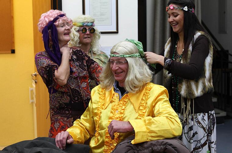 Streng geheim Bereits im Vorfeld machten die Damen des Bürgerbüros streng geheime Verteidigungspläne, in die die "obere Etage" erst unmittelbar vor dem drohenden Sturm eingeweiht wird. Stilgerecht kleidete Margarethe Breitenbach aus ihrem umfangreichen Fundus alle Verteidiger als "Flowerpower Hippies" ein.