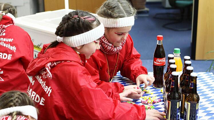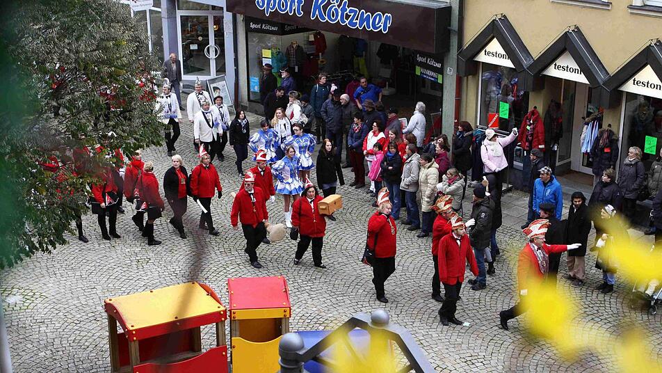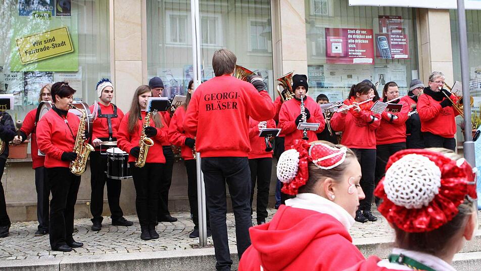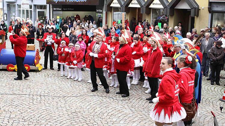 Diese Flucht war auch notwendig, hatten sich die Brückenauer Karnevalisten nicht nur mit den Georgi-Bläsern verstärkt, sondern auch die befreundeten Gesellschaften aus Ebenhausen, Hammelburg und Hofbieber stellten erhebliche Truppenkontingente, darunter einen Fanfarenzug. Als Ausgleich für die leere Stadtkasse präsentierten die Karnevalisten eine prall gefüllte Schatztruhe mit Goldnuggets, frisch geschürft am jüngst erst aufgefüllten Siebener Strand neben der Sinnflut.