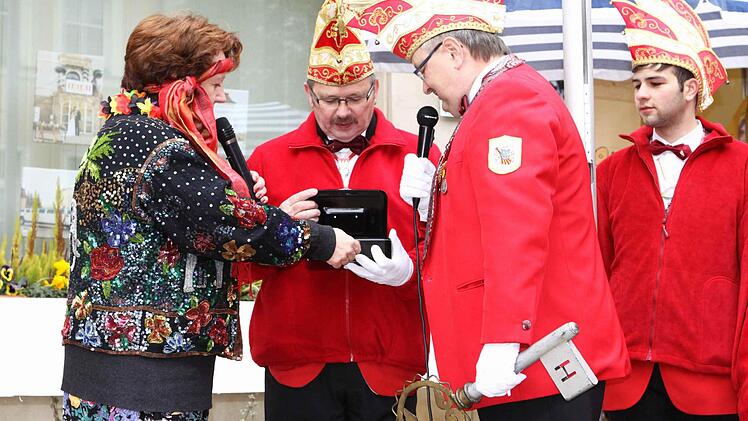 Leere Kasse, volle Schatztruhe "Bekifft" säuselnd nahm Bürgermeisterin Brigitte Meyerdierks im Rededuell mit den Karnevalisten diesen den Wind aus den Segeln, um schließlich samt leerer Stadtkasse und Rathausschlüssel über die Feuerwehrdrehleiter die Flucht aus dem gestürmten Rathaus zu ergreifen.