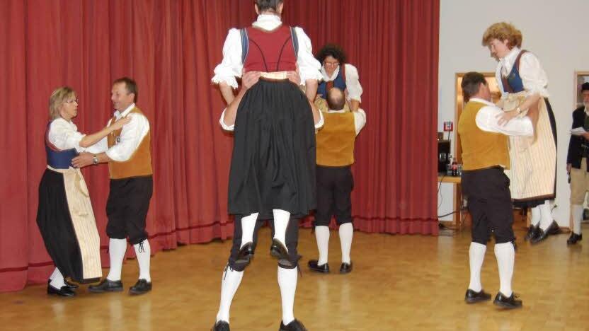 Einfach dazu gehören an einem solchen Abend, die fränkischen Tänze wie Patscher, Kirwepolkas, Schecher, s`Bauernmadle und Sternpolkas. Hubert Schenk, selbst ein leidenschaftlicher Tänzer, bedauerte den fehlenden Nachwuchs. Für ein nettes Bild auf der Bühne sorgten in ihren bunten fränkischen Trachten der Rhönklub aus Völkersleier, der Gartenbauverein Fuchsstadt und die Volkstanzgruppe aus Oberthulba. Damit der Rhythmus passte das garantierten die Blasmusiker aus Diebach und Horst Unbehaun aus Arnshausen. Der Gesangverein Sängerlust aus Oberthulba mit Dirigent Nikolaus Metz wartete mit einem Lied von Paul Warmuth "So ein Schöpple Frankenwein" sowie "Fröhliche Rheinländer" und dem lustigen Stück "Der Hahn von Onkel Giacometo" auf. Auch das Kikereki des Hahnes, das früher mehr in den Ortschaften zu hören war, war dabei zu hören. Immer mehr kommt in den Dörfern das Wirtshaussingen auf. So begleitete dieses gemeinsame Singen auch diesen Abend. Dass das auch Spaß machte dafür sorgten die beiden musikalischen Könner auf diesem Gebiet, die Brückenauer Toni Büchner mit seiner Gitarre und Christian Eilingsfeld mit dem Akkordeon. Musikalisch ging es mit ihnen in die Rhön und auf den Kreuzberg hinauf. Mit schönen Frauenstimmen überraschten auch die Damen aus der Nachbarortschaft Frankenbrunn. Die Laibachlerchen eine Gruppe des dortigen Gartenbauvereins unterstützt seit Jahren kirchliche und öffentliche Veranstaltungen. Für den richtigen Takt sorgte an diesem Abend ihr Leiter Florian Schaub bei den Liedern "Achte die Natur", "Wie schön ist es ein Rhönkind zu sein" und einem Ständchen über die Rhön. Viel für fränkische Volksmusik machen seit vielen Jahrzehnten die Reichenbacher Musikanten. Sie mit Birgit Döhler derzeit an der Spitze sind auch bekannt geworden durch ihre geistliche Musik. Sie spielten mit ihren Trompeten, der Tuba, Akkordeon und ihren Klarinetten ebenfalls Walzer und Dreher. Nicht fehlen durfte bei ihnen der aus Reichenbach stammende Kirmes-Schottisch.