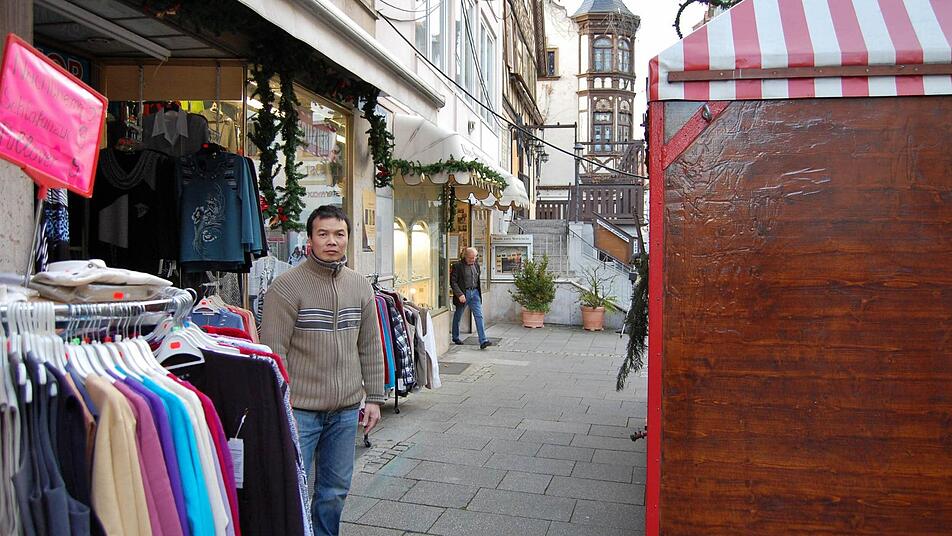 Bratwurstdunst und Klamotten Während die zwei Geschäftsinhaber etwas beruhigter scheinen, hat es diesmal den vietnamesischen Textilhändler Ngo Ngoc Quang in der Unteren Marktstraße erwischt. Nur ein schmaler Durchgang bleibt zwischen einer Verkaufsbude und seinem Geschäft. Anfangs war er sehr erschrocken und deutete diese scheinbare Schikane als Zeichen von Ausländerfeindlichkeit. Erst der nachbarschaftliche Beistand von Johannes R. Köhler sowie ein langes Gespräch mit Thomas Lutz (Stadtmarketing) und Geschäftsführerin Birgit Rechtenbacher (Pro Bad Kissingen) besänftigte ihn wieder. Inzwischen kann Quang wieder lächeln und zeigt Verständnis. Er weiß, dass die Bude im nächsten Jahr vor einem anderen Geschäft stehen wird. "Diesmal habe ich Pech gehabt."