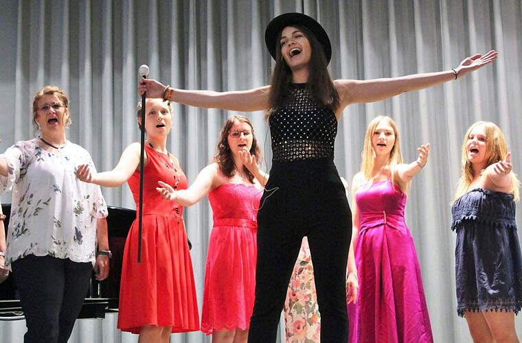 Willkommen, Bienvenue, Welcome: Mit dem Gassenhauer der Sally Bowles aus dem Filmklassiker "Cabaret" begrüßte Sandra Weipert die Zuhörer zum Sommerkonzert des Gesangsstudios Iva Simon im Bad Bockleter Kursaal. Stilecht gekleidet, rief sie mit einladender Geste ihres Zylinders die Mitschülerinnen der Gesangsklasse auf die Bühne und alle zusammen sangen den Welthit der Liza Minelli. Schwungvoller Beginn eines heiteren Nachmittags, bei dem nicht nur die Familienangehörigen und Fans, sondern auch die Kurgäste des Biedermeierbads prächtig unterhalten wurden.