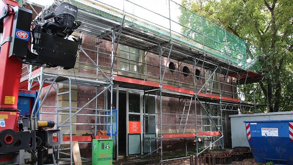 zu erkennen. Das Gebäude aus verschiedenfarbigen Sandsteinen hatte früher an allen Seiten Fenster bis zum Boden, zur Saale hin wurden sie wegen des Anbaus nachträglich zugemauert. Früher sei hier der Strom für den gesamten Luitpoldpark erzeugt worden: Entlang der Wege und rund um die Plätze für Gesellschaftsspiele brannte früher Licht.