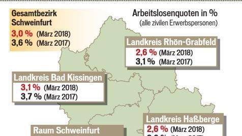 Im Gegenzug mussten sich 2383 Arbeitnehmer erstmals oder erneut arbeitslos melden. Dies waren 338 Personen weniger als im Februar. Am günstigsten war die Veränderung der Arbeitslosigkeit innerhalb des Agenturbezirks Schweinfurt in Bad Kissingen; dort sank der Bestand an Arbeitslosen gegenüber dem Vorjahresmonat um 18 Prozent.