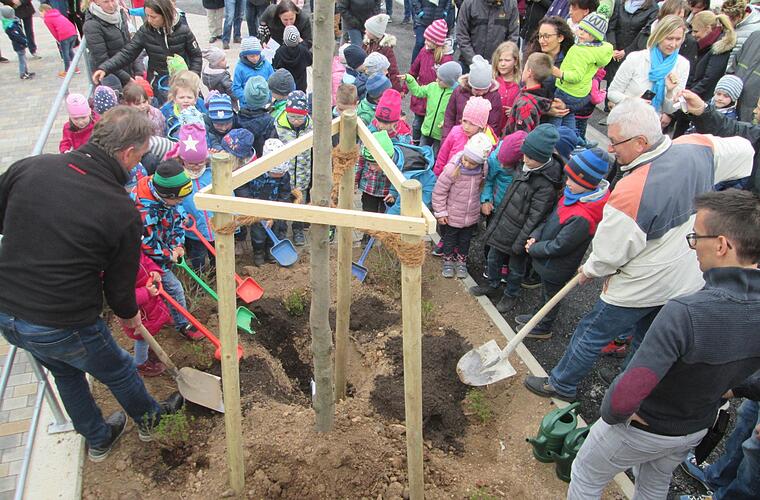 Neben den zahlreichen Eltern und Großeltern stellten sich natürlich auch die Jüngsten ein. Die Kinder aus dem Kindergarten sangen Frühlingslieder und wünschten dem Baum mit einem Gedicht ein gutes Gedeihen. Danach ging es ans Werk. Ruser und Hart sowie einige Kinder griffen zu den Schaufeln und gruben den Baum ein.