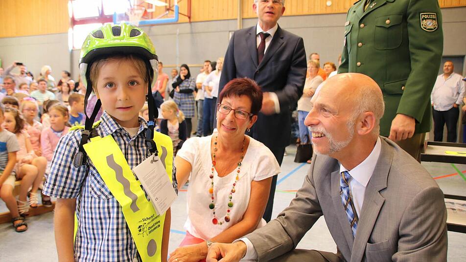 der Bad Kissinger Oberbürgermeister Kay Blankenburg. Die Stadt schenkte deshalb mit Unterstützung von Sponsoren wie der Sparkasse, jedem Erstklässler der Sinnberg-Grundschule einen Fahrradhelm. "Ich kenne keine Schule, in der die Schüler so tolle Sachen bekommen", freute sich Schulleiter Karl-Heinz Deublein mit den Schülern.