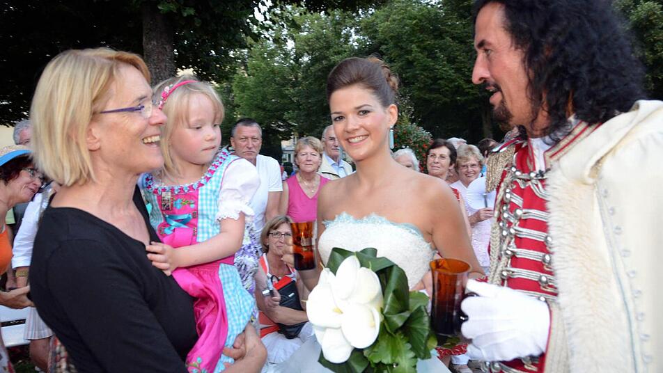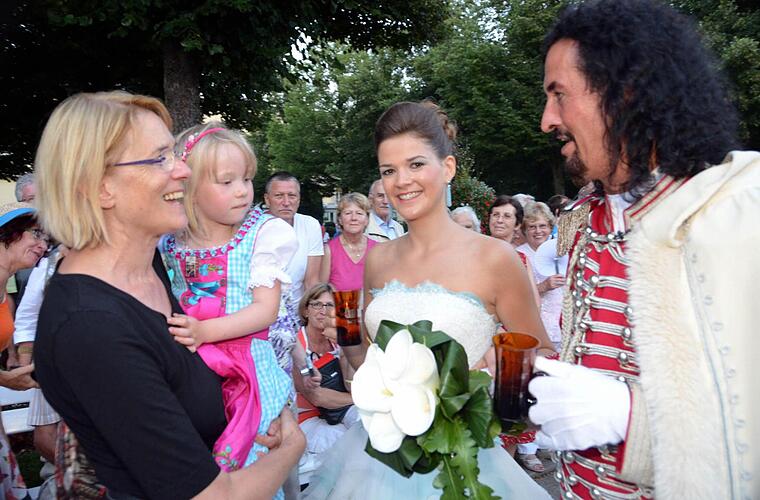"Heiße" Vorstellung Ungewöhnlich wenige Zuschauer kamen aber am Samstagnachmittag zur Vorstellung der Historischen Persönlichkeiten im Rosengarten. Während sonst bereits eine halbe Stunde vorher die Zaungäste in Fünferreihen rund um den Präsentationsort stehen und sich beste Plätze sichern, gab es heuer nur Gedränge um die wenigen schattigen Plätzen. Erst als das Jugendmusikkorps die Persönlichkeiten anspielte, drängten Menschenmassen von weiter entlegenen schattigen Plätzen zur Wiese vor dem Brunnen, wo die Historischen von Hofmarschall Christian Schwarz vorgestellt wurden.