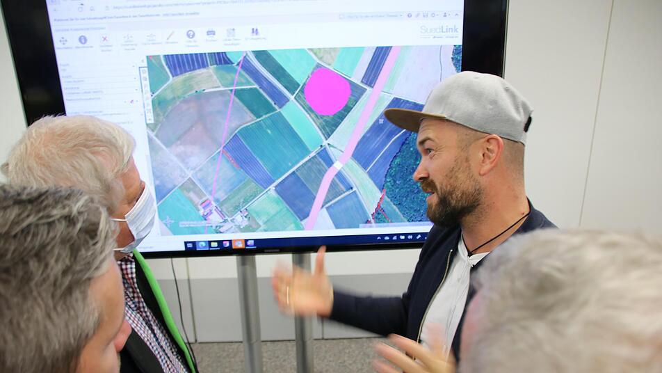 Auch wenn der Infomarkt primär für die Fulda-Main-Leitung gedacht war, die 2031 in Betrieb gehen soll, stellte Chris Goepfert vom Netzbetreiber TransnetBW auch den Planungsstand zu Südlink vor: Dort wird innerhalb des bereits beschlossenen 1000-Meter-Korridors gerade eine ganz genaue Trasse geplant. "Die gehen quer durch die Äcker", kommentiert Greubel den Verlauf in der Ramsthaler Gemarkung Arnsteiner Weg. Am Monitor fragen Greubel und der Sulzthaler Eugen Büttner, weshalb die Leitung denn nicht am Weg entlang oder am Waldrand verlegt werde, um den Ackerboden zu schonen. Goepfert dagegen verweist auf naturschutzfachliche Belange. "Wir wollen natürlich, dass möglichst wenig Wald betroffen ist", sagt etwa Bernhard Zürner, Abteilungsleiter beim Amt für Ernährung, Landwirtschaft und Forsten.