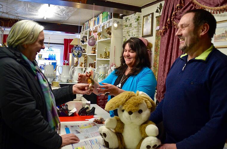 Maria Albert ist unschlüssig. Soll sie die Holztulpen nun mitnehmen oder nicht? Eigentlich hat sie schon genug gefunden, was sie heute gerne kaufen möchte: ein Huhn aus Ton, zwei Engel und einen großen Plüschhasen. "Das wird meine Osterdeko, die Engel verschenke ich", erklärt sie und bezahlt. Drei Euro fünfzig für alles. Echte Schnäppchen. Maria Albert kommt aber nicht nur deswegen in den kleinen Trödelladen hinterm Burkardrother Rathaus.