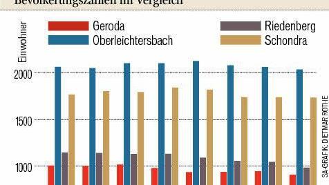 Die VG im Überblick:Einwohner Seit acht Jahren ist die Einwohnerzahl in der VG insgesamt rückläufig. 2012 liegt sie bei nur noch 5633 Einwohnern in allen vier Gemeinden, der Höchststand lag 2004 noch bei 6027. Dabei ist die Entwicklung in den einzelnen Gemeinden sehr unterschiedlich: Während Schondra und Oberleichtersbach zwischendurch sogar Bürger dazu gewannen und heute noch über dem Stand von vor 20 Jahren sind, verlieren Geroda und Riedenberg massiv (siehe Grafik). Die aktuellen Ein wohnerzahlen im Einzelnen: Geroda 899, Riedenberg 975, Schondra 1728 und Oberleichtersbach 2031.