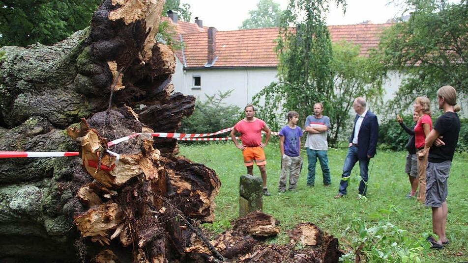 Am Mittwochvormittag besichtigte Bürgermeister Helmut Blank den Hindenburgpark, nachdem er von Anwohnern verständigt worden war. Elisabeth Mehler, die wenig oberhalb wohnt, plädiert dafür, dass der Stamm als Naturdenkmal im Park erhalten bleibt. "Andere haben Kunstobjekte im Park, hier haben wir ein natürliches Kunstobjekt", betonte sie. Bürgermeister Helmut Blank zeigte sich für eine solche Lösung offen. Allerdings müsste erst geklärt werden, ob Sicherheitsaspekte nicht dagegen sprechen. Wenn der Stamm allerdings an Ort und Stelle dauerhaft liegen bleiben soll, dann müsste der zentrale Weg im Park um den Baum herumgeführt werden. Dieser Weg dient immer noch als eine Zufahrt zu einem Anwesen am Ende des Parks. Ein Fachmann schätzt das Alter der hohlen Linde auf 250 bis 300 Jahre.