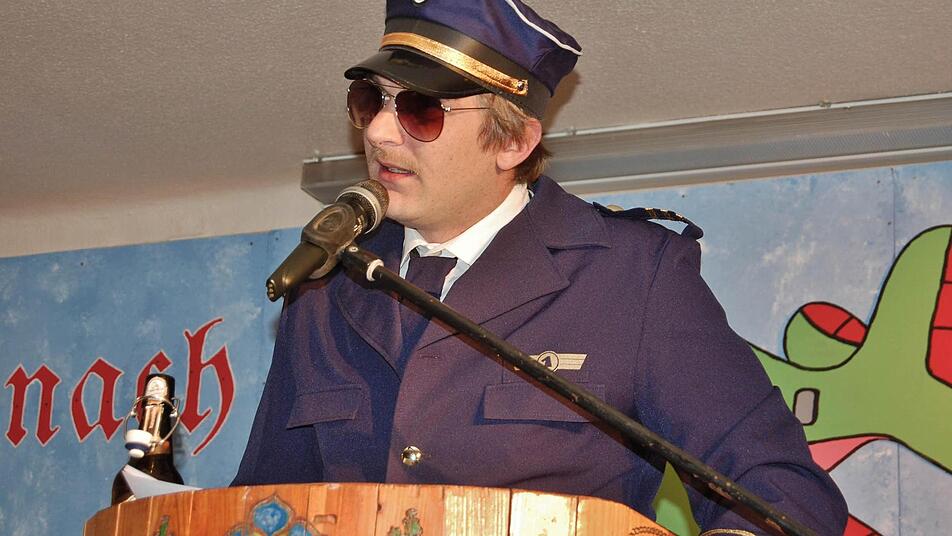 Sitzung mit einem dreifachen "Stänich Helau" eröffnet hatte. Zünftig uniformiert und mit dunkler Pilotenbrille erklärte der Flugkapitän seinen Gästen erst einmal mit deutlichen Worten, wo es lang geht. Nichts wurde ausgespart, was sich 2014 in Steinach abgespielt hatte, alles und jeder wurde beim Namen genannt. Natürlich schimpfte er über die geschlossene Henneberghalle, denn nur deren Bühnengröße könne ihm das angemessene Podium