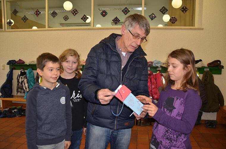 Auch Isabella beobachtet gerne Vögel. Deshalb hat sie die Futterstation aus dem Milchkarton gebastelt. "Die Anleitung dazu habe ich in einem Buch hier in der Schule gesehen", sagt sie. Doch es ist nicht ihre erste Bastelei. Eine weitere Futterstation hängt bereits im heimischen Garten in Stralsbach. "Es kommen viele Meisen und auch ein Star", erzählt die Zehnjährige. Der hatte diesen Sommer unterm Dach gebrütet. Nun möchte Isabella von Dieter Fünfstück wissen, wo sie die zweite Futterstation am besten anbringen kann. "Die kannst du ruhig etwa zwei, drei Meter von der anderen entfernt dazu hängen", empfiehlt der Experte.