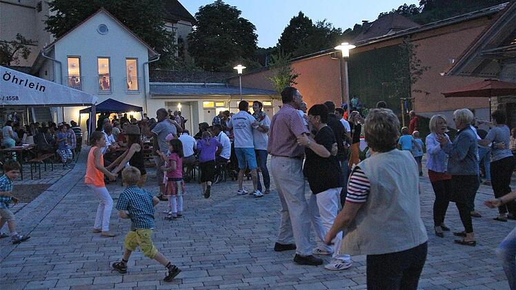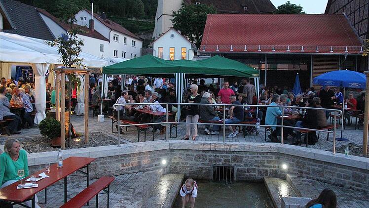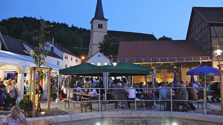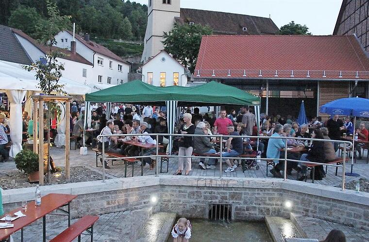 Zum Testfest wurde die erste Feier auf dem neuen Sulzthaler Dorfplatz mit dem Weinfest am Wochenende. Besonders in der hereinbrechenden Dunkelheit am Abend wirkte die ausgeklügelte Beleuchtung für die Stimmung der Gäste auf dem ziemlich voll besetzten Platz. Zur Musik der Band Horch tanzte man gern auf dem neuen Pflaster.