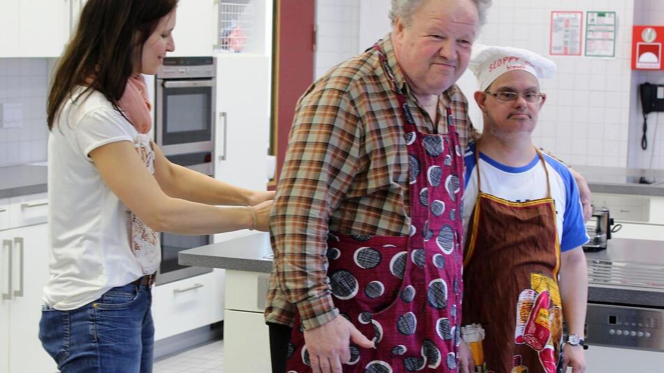 Da waren Kartoffeln zu kochen, Käse zu sortieren, musste geschnippelt, geschält und gewürfelt werden, was in die kleinen Pfännchen passt. Die Dipl. Sozialpädagogin stellt das Gericht erst einmal vor. Dazu hat sie in ihrem umfangreichen Ordner mit Rezepten die entsprechende Seite aufgeschlagen. Es zeigt die einzelnen Arbeitsschritte im Bild, denn nicht alle können lesen. Ziel des Kurses ist, fachgerechten Umgang mit Lebensmitteln zu vermitteln, Handlungskompetenz und soziales Verhalten zu fördern. "Kochen ist mein Hobby", verkündet Markus und lässt sich von Frau Leurer die Schleife der Schürze knoten. "Ich koche mit Mama zusammen, aber spülen und abtrocknen mach ich allein". Betreuerin Claudia Nieland ergänzt: "Markus ist von Anfang an dabei, schreibt alle Rezepte ab und verschenkt sie".