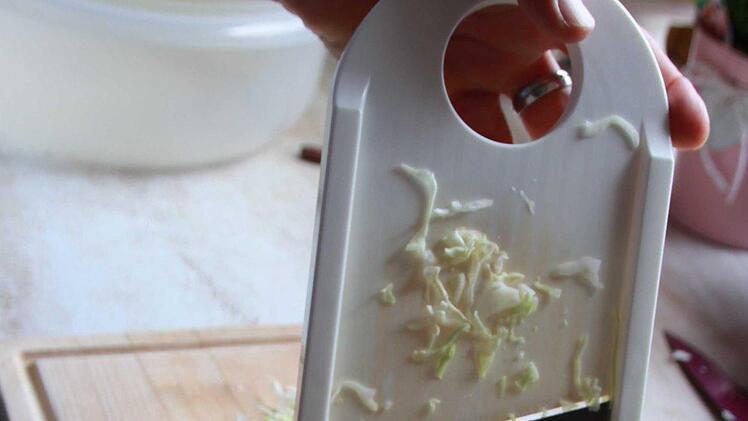 Mit einem Griff zieht Sigrid Kleinhenz einen ihrer treuesten Küchenhelfer aus der Schublade. Karotten und rote Beete mag sie am liebsten grob geschnitten, erzählt sie. Dieser Hobel aber ist für feines gedacht - wie Gurkensalat und: Krautsalat. Nachdem sie die äußeren Blätter vom Kohl entfernt und den Strunk gerade abgeschnitten hat, halbiert sie den Spitzkohl. Den Strunk behält der Kohl - so fällt er nicht auseinander und Sigrid Kleinhenz hat jetzt beim Hobeln etwas zum Zupacken. Die Reste hackt die 57-Jährige mit dem Messer fein. "Es kommt nix weg", sagt Sigrid Kleinhenz. Wenn der Krautkopf zu feinen Streifen geworden ist, setzt sie den Sud auf: Für den 700-Gramm-Kohl reichen eine Tasse Essig, eine viertel Tasse Öl, eine halbe Tasse Zucker und ein Teelöffel Salz. Zusammen aufkochen lassen und gründlich unter den Kohl mengen.