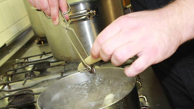 Nach dem Abbürsten schnappt sich Koch-Kollege Florian "Flo" Grone den Sparschäler und versenkt die nackten weißen Stangen im Wasser. Ein Spritzer Zitrone verhindert, dass sie grau anlaufen, erklärt der Fachmann. (Mit Milch oder Essig funktioniert es genauso.) Wichtig: In Handschuhe schlüpfen, sonst kleben die Finger später. In kochendem Wasser gart die Schwarzwurzel 20 Minuten. Soll sie in der Pfanne nachher noch feine Röstaromen abbekommen, verbringt sie nur die Hälfte der Zeit im heißen Wasser. Michael Hergenröder will seinen Zutaten Geschmacks-Vielfalt entlocken und auf dem Teller zeigen, was möglich ist. "Verschiedene Texturen machen es interessanter."