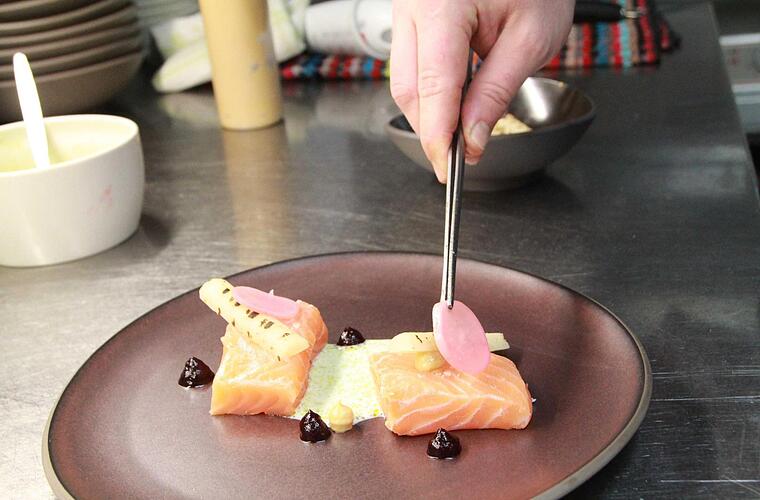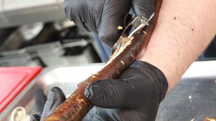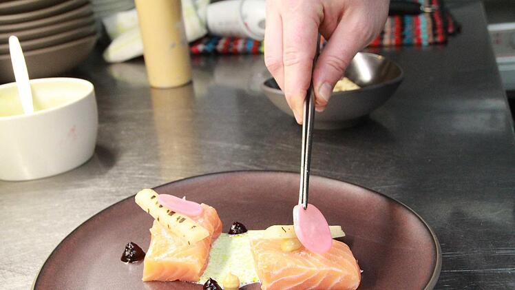 Asiatisch, vegetarisch, typisch deutsch - mit der Schwarzwurzel lässt sich viel anstellen, meint der 25-jährige Koch. Heute will er das Wintergemüse in eine Vorspeise einbauen. Dafür landen die Stangen nach dem Blanchieren zunächst im kaltem gesalzenem Wasser, damit sie nicht nachgaren. In einer heißen Pfanne holen sich die blassen Stiele braune Grill-Streifen ab. Zu dem gegrillten Gemüse gibt es Lachs, in Gin gebeizt, einen Sud aus Kefir und Kräuteröl, Tupfen aus Miso-Paste und roten Rüben, und obendrauf eingelegte Radieschen und die krossen Schwarzwurzel-Chips - eine spontane Kreation des 25-Jährigen. Der empfiehlt, sich getrost an das Wintergemüse heranzuwagen. Und: "Einfach ausprobieren."