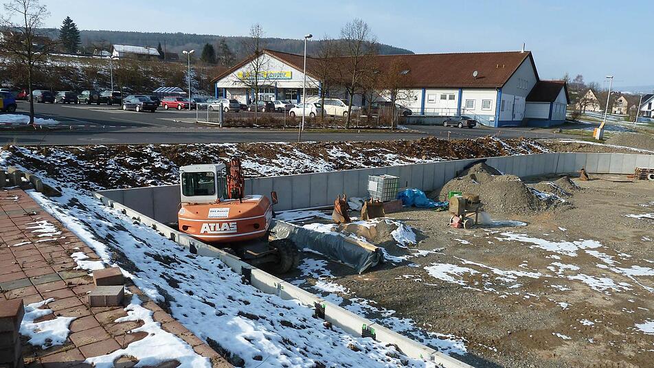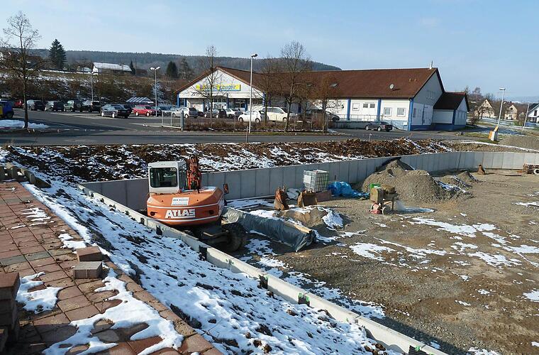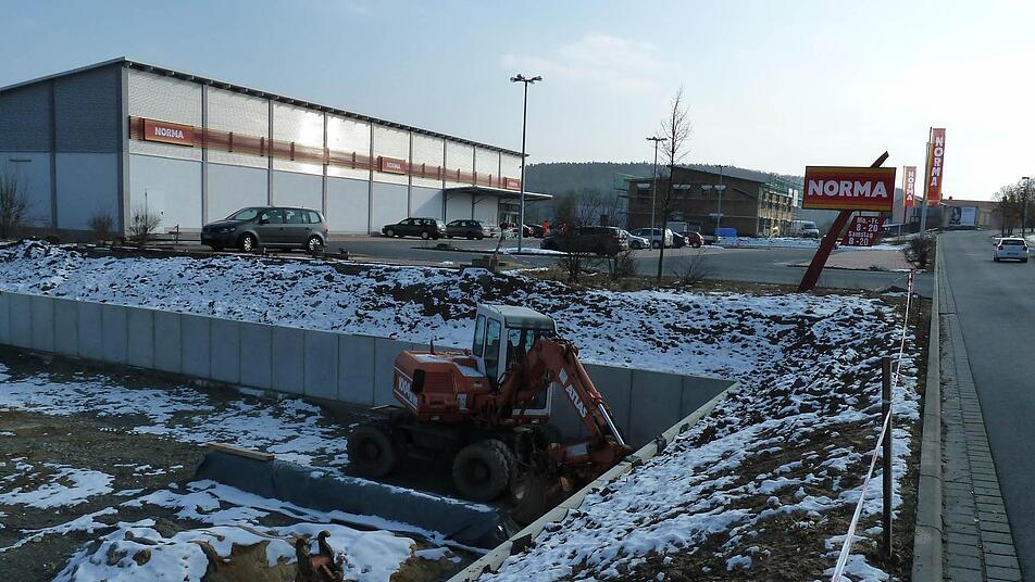 Seit einigen Monaten wird im Gewerbegebiet gebaggert und gebaut. Steht man vor dem Discounter, wurde links davon eine Grube ausgekoffert und mit Betonelementen gesichert. Die Arbeiten ruhten über den Winter. Auf der anderen Seite von Norma geht es mit dem Fertighausbau von Elektro Zehe voran.