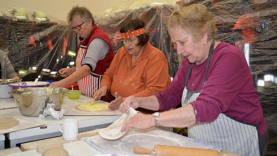 Im Feuerwehrhaus haben die Frauen das Sagen. Sie stehen an Tischen und machen lauter Sachen, die eigentlich total untypisch für ein Domizil der Floriansjünger sind. Sie kneten, rollen aus, belegen, bestreichen und schwatzen. Schließlich gehört das auch dazu, wenn in Frauenroth Plootz gebacken wird. Das geschieht zwei Mal im Jahr: im Frühjahr kurz nach Ostern und im Oktober. Am vergangenen Samstag war es wieder so weit. Dann verwandelt sich das Feuerwehrhaus in eine Plootzküche, dann verschwinden die Uniformen und Gerätschaften der Floriansjünger hinter riesigen Planen.