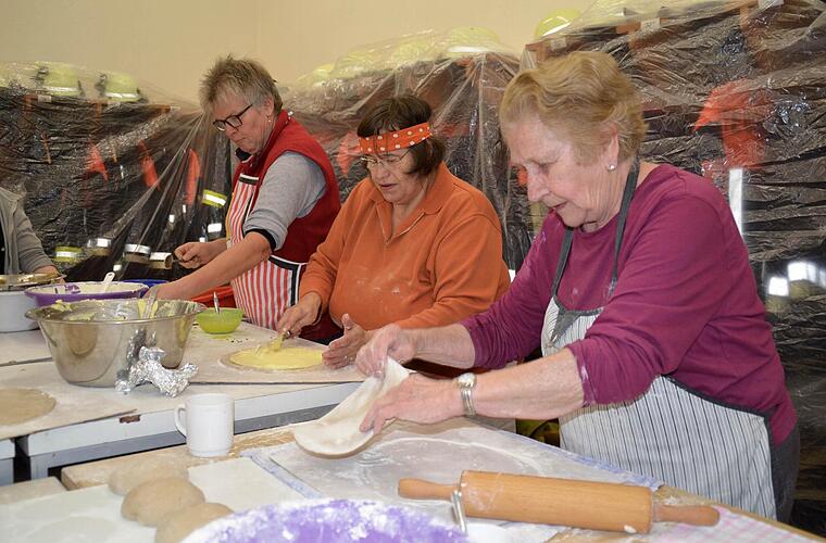 Für die Frauen heißt das: Arbeiten im Akkord. Plootz um Plootz wird ausgerollt und belegt. Das geschieht recht zügig, weil jeder Handgriff sitzt. "Wir sind halt ein eingespieltes Team", sagen die Frauen. Die Älteste ist Thekla Grom mit 84 Jahren, die Jüngste ihre Enkelin, ein Teenager. "Ich habe schon als junge Frau geholfen", erinnert sich die rüstige Seniorin.