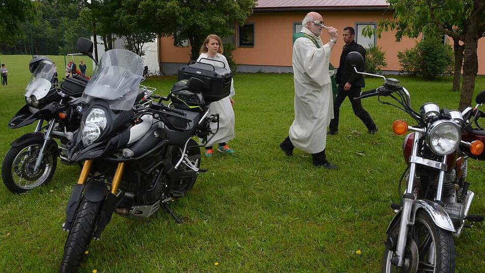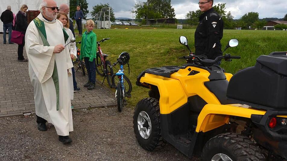 einer Ministrantin die auf beiden Parkplätzen aufgestellten Fahrzeuge ab und segnete vom Zweirad über das Quad bis hin zu den Pkw alles, was Räder hatte und dem Vorwärtskommen diente.