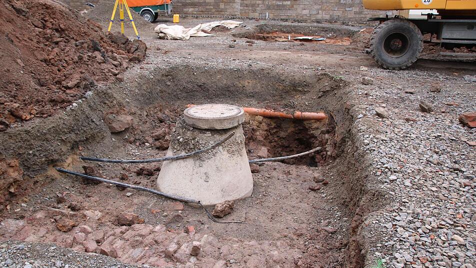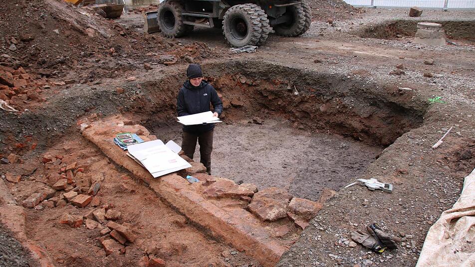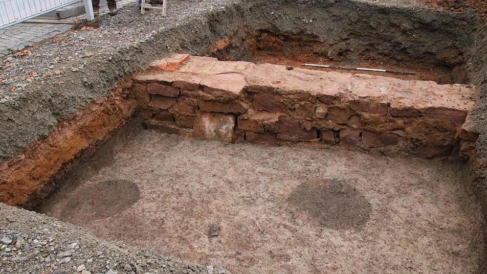 Vor den Arbeiten draußen suchten die Archäologen der Schwebheimer Firma "Ausgrabungen Specht" zunächst im Archiv: Lagepläne aus dem Jahr 1889 waren die Grundlage für die insgesamt fünf Sondagen, die in Absprache mit dem Landesamt für Denkmalpflege vorgesehen sind. Knapp einen Meter unter der Oberfläche stießen die Archäologen auf die ersten Befunde: Eine Sandsteinmauer und Sandstein-Pflaster einer alten Durchfahrt dürften aus dem 19. Jahrhundert stammen.