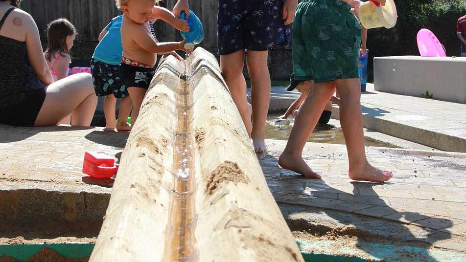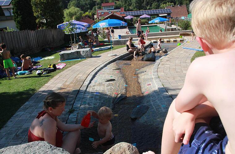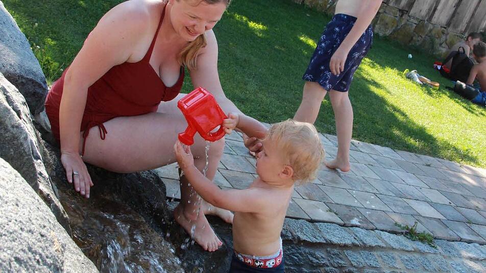Am besten hat der Familie der Wasserlauf gefallen, der am oberen Ende des Schwimmbad-Geländes beginnt und sich über einen Bachlauf den Hang hinunterschlängelt. Das Plätschern sorgt für Spaß vor allem bei Klein Bennett. Der ist eine wahre Wasserratte und kommt beim Planschen in dem seichten Wasser voll auf seine Kosten. Mit seinen Brüdern kann er Staustufen bauen und im Sandkasten matschen. "Vor allem die kleinen Kinder haben Spaß in dem Bachlauf", sagt Steffi. Auf der unteren Ebene brausen die zwei älteren Jungs am liebsten die Wasserrutsche hinab ins Schwimmerbecken. "Für einen ordentlichen Bauchplatscher reicht die kleine Rutsche", sagt Rutschen-Spezialist Lauritz. "Jugendliche, die gerne springen, brauchen ein anderes Schwimmbad, aber für Familien ist das hier genau richtig", sagt Stephanie.