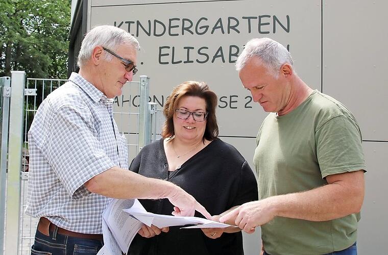 Also wurden alle möglichen Optionen geprüft: Einen Verkauf an die Stadt lehnte die Kommune dankend ab, auch der komplette Abriss und ein Neubau an der Stelle standen zur Diskussion. Am Ende fiel im Jahr 2012 der Grundsatz-Beschluss für eine Sanierung. Schließlich fügt sich der Kindergarten gut ins Ensemble ein: "Hier ist alles in Sachskantwaben gebaut", erläutert Erwin Hippler den Grundriss: Als erstes entstand 1972 die St. Elisabeth-Kirche, in den beiden Jahren danach folgten Pfarrzentrum und Kindergarten.