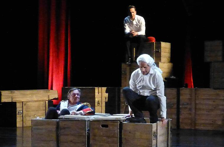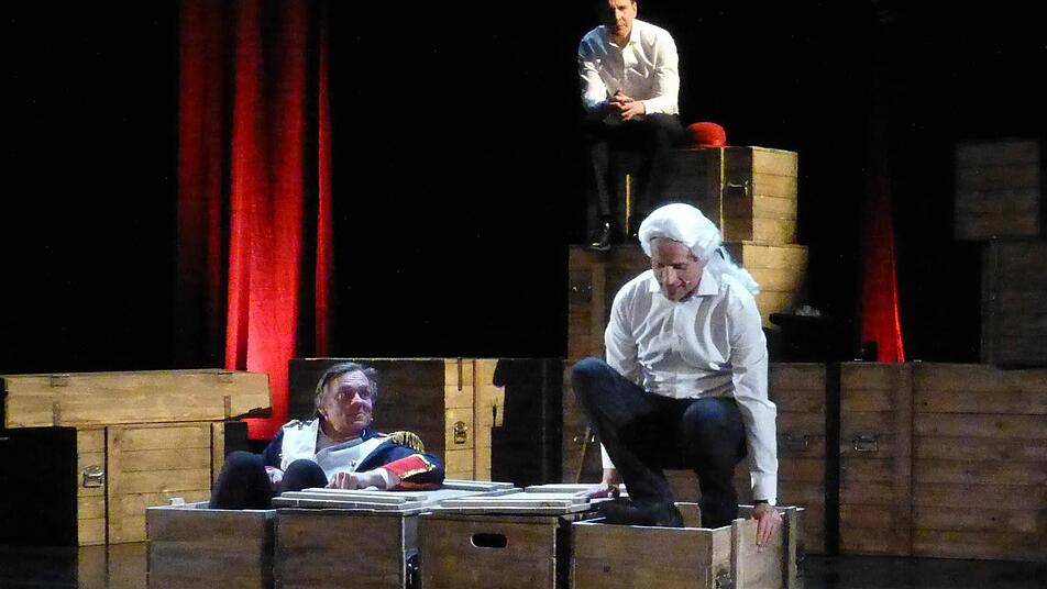 Doch - und das ist einer der großen Unterschiede zur Shakespeareshow - im Gegensatz zum englischen Dramatiker gibt es über Goethe eine Fülle von Wissen über sein wirkliches Leben. Und auch das erzählen, spielen, diskutieren die drei Herren im Verlauf des Abends, von Goethes Jurastudium bis zur Italienreise, jener Befreiung für Sinne und Sex. Michael Ehnert sächselt den Weimarer Herzog, Kristian Bader keift die Charlotte von Stein, französelt den Goethefan Napoleon und erhebt sich dann als über Goethe räsonierender Marcel Reich-Ranicki mit perfekt imitierter Diktion noch in unsere fast unmittelbare Gegenwart.